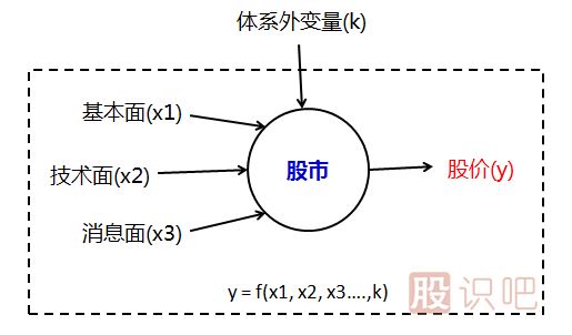 第一, 股價是個多變量系統(tǒng)。炒股的人千千萬萬,每個人買賣股票的理由也不盡相同,有基于基本面的,有技術(shù)流的,也有聽消息,甚至還有憑感覺亂炒的,不一而足。如果把股市認為是一個函數(shù)的話,那么上述那些影響股價的因素就是一系列自變量,股價則是應(yīng)變量,大致如下圖所示: