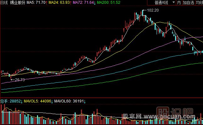 錫業(yè)股份(000960)該股的上漲通道非常明顯,均線組合形成發(fā)散向上的完美形態(tài)。我們認為所有超級強勢股都是這樣子的均線形態(tài)。5日線在最上面,24日線在第二,72日線在第三,200日年線在最下面的組合排列將股票推升到一個讓人無法想像的高度。其實股票走勢是有一定規(guī)律的,每次瘋狂上漲的股票都是90度角斜率向上漲停爆發(fā)的,一旦資金跟不上,成交量萎縮就會引發(fā)暴跌。如果是以30度角斜率上漲的股票通常均線非常完美的時候會出現(xiàn)長期上漲的趨勢。主力資金勢力也是巨大的,只是主力不想一下引起別人的關注而已。通常上漲過程中很少漲停,不想暴露自己的交易席位,不想成為大眾的目標。大部分真正賺錢的人通常是非常低調的,不愿意引起別人的關注。我們認為股票是沒有絕對的好與壞之分的,只有強勢階段和弱勢階段之分,強勢當然就是積極參與賺錢順利。弱勢階段就是跌跌不休,最好遠離。很少人能夠在弱市當中成功賺錢,只有極少數(shù)人能夠幸免于股災。為了成功抓住黑馬的啟動點,我們一定要專注去研究短線牛股或者是長線牛股的啟動點特征。錫業(yè)股份也是這樣一只標準的強市大牛股。