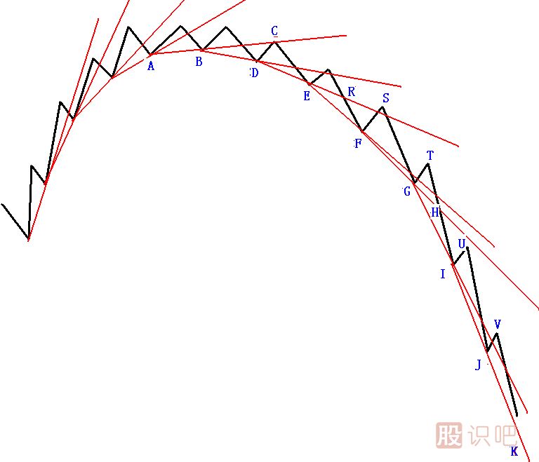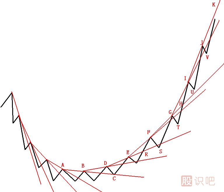 隨著內(nèi)徑線越來越陡峭地下跌,終于內(nèi)徑線變成不可能跌破之線,成為支撐線。如圖中JK線可能更陡峭,股價(jià)遇支撐可能反彈,幾次反彈,會(huì)形成股價(jià)底部或中級(jí)底部。