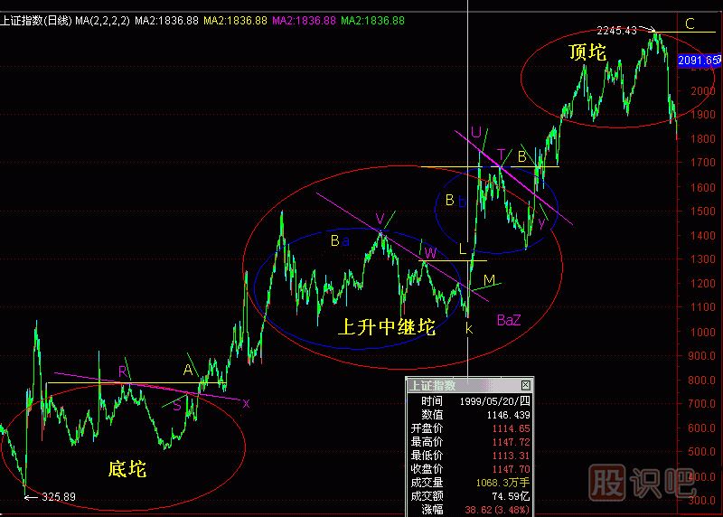 本例中“上升中繼坨”是由兩個(gè)小“坨”組成的,它們是“Ba坨”和“Bb坨”。一般來(lái)說(shuō),在“底坨”和“頂坨”之間,可能出現(xiàn)許多小“坨”。只要它們的功能是“上升中繼”,都可合并為一個(gè)大的“上升中繼坨”。(圖286-4)中“Ba坨”的筷子線是WL和WV,向上突破后,發(fā)生LU的一波行情,這就是我和左安龍作電視節(jié)目所預(yù)測(cè)的那一波行情。“Bb坨”的“筷子線”是TB和TU,在Y點(diǎn)附近,是洗盤的最后階段。成交量充分萎縮,下跌空間越來(lái)越小,一輪行情呼之欲出。這里是2000年1月1日,記者夏雄偉采訪我后寫了《未來(lái)行情高不可測(cè)》一文,刊登在《證券時(shí)報(bào)》上。由于“Bb坨”向上突破,既是對(duì)“Bb坨”的突破,又是對(duì)整個(gè)“上升中繼坨”的突破,是雙重“坨突破”,更具技術(shù)意義,所以這次預(yù)報(bào)的“底氣”是十足的,我頂著空方輿論壓力,獨(dú)唱多調(diào)。事實(shí)證明,這輪行情一漲就是一千點(diǎn),千年之交成功地預(yù)測(cè)了“千點(diǎn)行情”。
