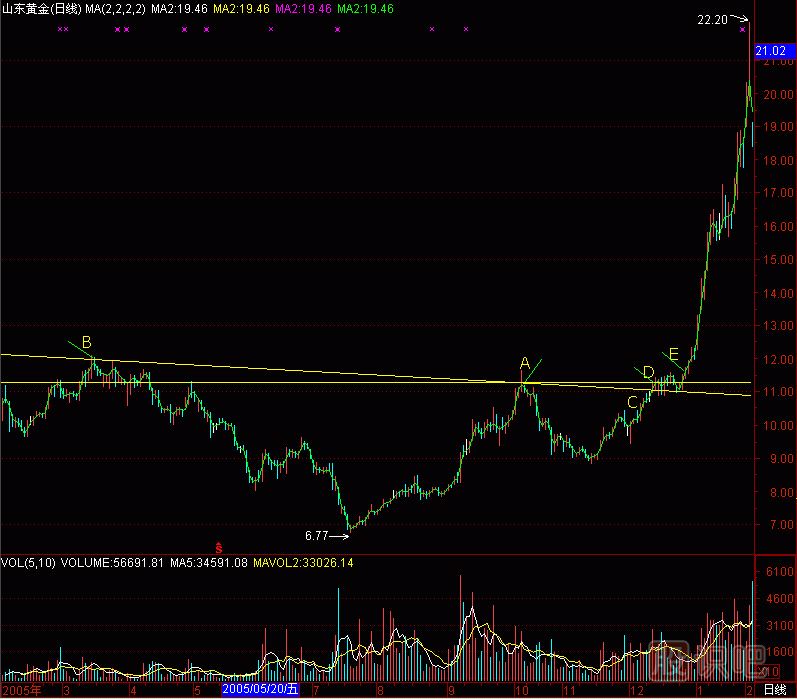 (圖286-7)是600547山東黃金的日K線圖,A點(diǎn)是“底坨”的高點(diǎn),畫一條“水平攔截線”,得到D買入點(diǎn),使用有“條件預(yù)警”功能的軟件時(shí),可點(diǎn)擊此“水平攔截線”,啟動(dòng)“自動(dòng)報(bào)警”功能。當(dāng)股價(jià)運(yùn)行碰及這條“水平攔截線”,電腦會(huì)自動(dòng)發(fā)出報(bào)警信號(hào),甚至可以給您發(fā)送手機(jī)短信。A點(diǎn)與前高點(diǎn)B畫一條“斜下攔截線”,得到C買入點(diǎn)。同樣可以給“斜下攔截線”作“條件預(yù)警”。(圖286-7)是設(shè)定“條件預(yù)警”的“水平攔截線”和“斜下攔截線”的山東黃金的股價(jià)日K線圖,當(dāng)山東黃金的股價(jià)在穿過(guò)C、D和E點(diǎn)時(shí),曾三次發(fā)出買入信號(hào)。