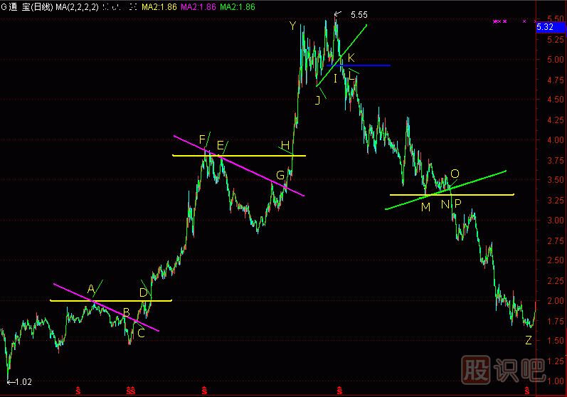 “頂坨”的低點(diǎn)I作“水平攔截線”,得到L攔截點(diǎn)。I、J作“斜上攔截線”,得到k攔截點(diǎn)。當(dāng)股價(jià)跌破K點(diǎn)準(zhǔn)備清倉(cāng)賣出,當(dāng)股價(jià)跌破L點(diǎn),就應(yīng)該完全清倉(cāng)。最好的安排是長(zhǎng)途旅游,遠(yuǎn)離股市。因?yàn)?ldquo;頂坨”的“筷子線”一旦失守,股價(jià)將有長(zhǎng)期下跌,此時(shí)多動(dòng)多輸,少動(dòng)少輸,不動(dòng)不輸。