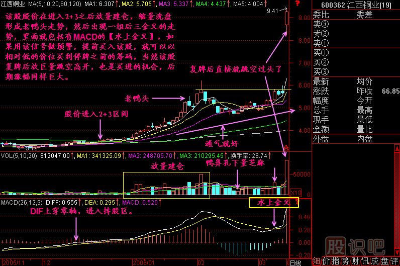 我們還練習過(guò)水下死叉沉船快一節,那一節正好和本節是對立的,本節是在水上(零軸線(xiàn)上)金叉,而那一節是在水下(零軸線(xiàn)下)死叉,它們所得到的效果正好的反的,水下死叉沉船快預示股價(jià)有一段加速下跌,而水上金叉則預示股價(jià)有一段快速上揚。