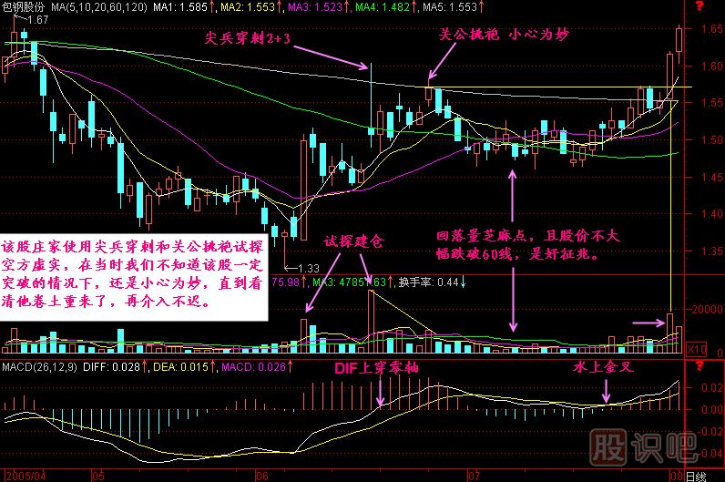 小結:120日均價線是半年線,在這里往往會遇到解套壓力,也許這里也正好是前面下跌過程中的一個平臺區(qū)域,如果該股有莊家要建倉,他一定要試探一下,看看上面有多少籌碼要拋出來,但他這個試探動作不像尖兵穿刺那么明目張膽的放量直接穿刺,他這個使用的是縮量、小心翼翼地靠近敵方的城墻邊,在那里悄悄刺探一下城里邊的情況,相當?shù)男⌒?,之后就會回落下來,根據(jù)情況再做后面的操盤計劃。