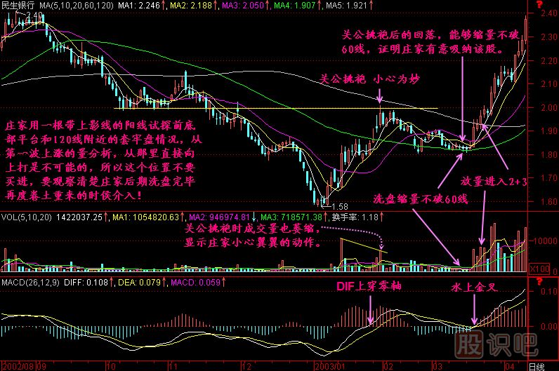 所以我們看到股價漲到2&3區(qū)間縮量靠近120線時,就要明白不會馬上上漲的,因為這是關公挑袍 小心為妙的時候,第一次遇到120線這么大的壓力,怎么可能不放量就穿越呢?所以不要激動,要觀察,等莊家試探完畢,回落至量芝麻點之后再度放量攻擊進入2+3時,我們再根據(jù)情況買進還來得及。