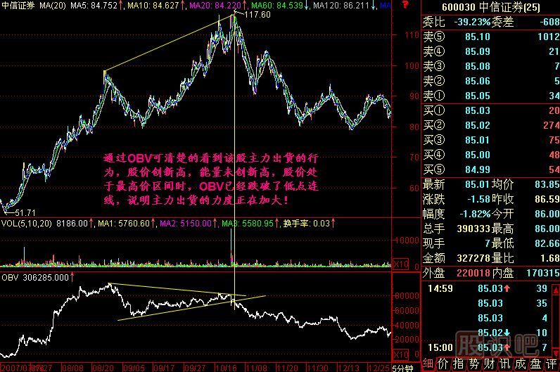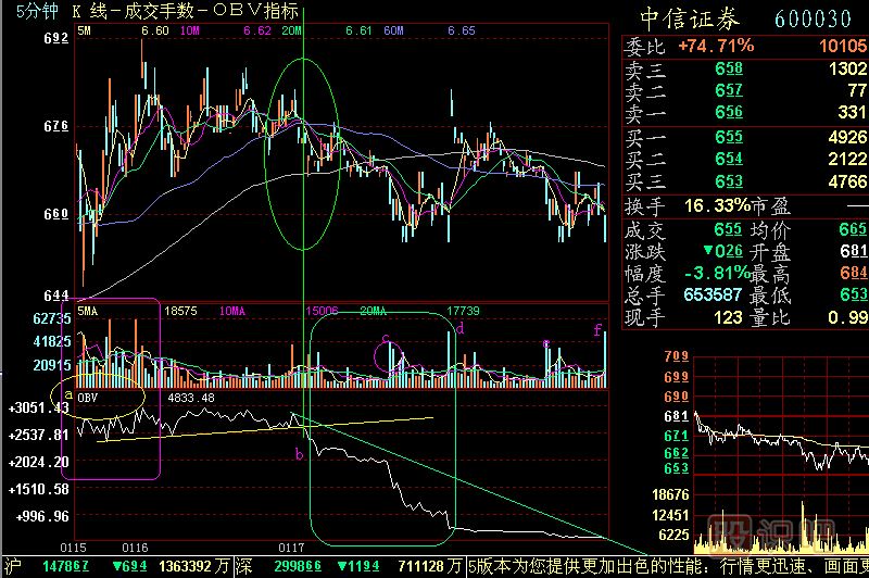 晚上剛剛收到一個(gè)Email,我們?cè)谌珖膶W(xué)員很多,對(duì)一些有典型意義的問題我們現(xiàn)在做一個(gè)統(tǒng)一回答。他問中信證券是不是在出貨?有這個(gè)感覺當(dāng)然很好。為了回答這個(gè)問題,我們把中信證券5分鐘K線調(diào)出來,然后分析下邊的OBV指標(biāo),見(圖204-1)所示。