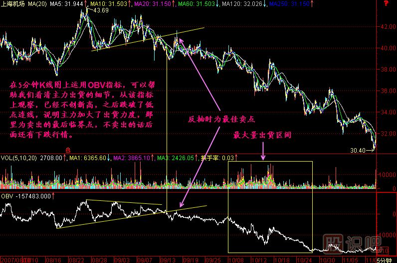 所以對(duì)于一個(gè)正在上漲的個(gè)股,我們?nèi)绾畏乐?a href=http://m.mztkc.com/GPRM/sy/1776.html target=_blank class=infotextkey>被套牢在頭部呢?就是在結(jié)合其它頭部技術(shù)研判的同時(shí),要使用5分鐘OBV能量潮分析一下,就可以做到莊家出貨看得清清楚楚了。