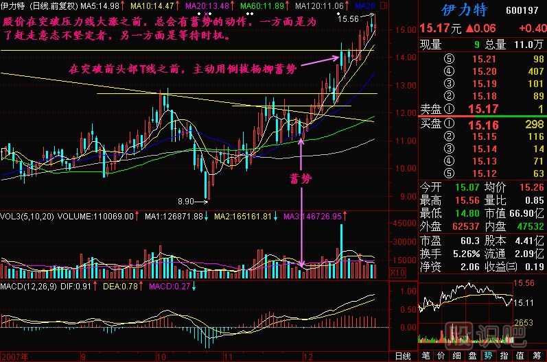 那么現(xiàn)在我要說第三個問題,我們要等待什么時候介入?股價現(xiàn)在是躲在這個地方,放了量以后要洗盤,洗盤要洗到什么程度?洗到量充分地萎縮。今天的量比只有0.56了,已經(jīng)相當(dāng)萎縮了,也就是說這一次洗盤已經(jīng)洗不出多少人來了,或者說散戶手里沒有什么籌碼了。這樣洗了三天,還是洗不出多少籌碼來,只要洗不出籌碼,沒有浮動籌碼了,莊家的目的就達到了。莊家不是不想漲,他也是天天想漲,但是有人跟在里面他就不放心,他就要把盤子洗干凈。因此,當(dāng)量比極度小的時候,最小量的時候就應(yīng)該介入了,向上爆發(fā)是隨時的事情。你不要看它現(xiàn)在不漲,它這是在蓄勢,是暴漲以前的一個蓄勢。我們可以這么比喻,把拳頭抽回來,是為了更有力地打出去,股價暴漲前的蓄勢就是這樣的。因此,現(xiàn)在不但不是賣出的時候,而是要買進的時候,買就要沿著H線買。