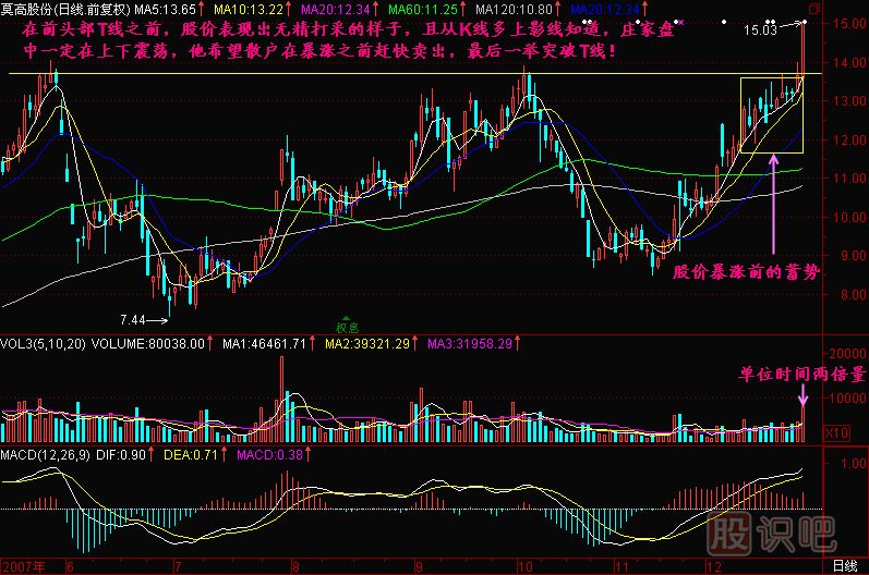 一般情況下股價在抵達T線或者高點連線壓力線附近時,總是表現(xiàn)出要沖高回落的樣子,但是股價并不大幅下跌,而是吸附在壓力線附近,隨著散戶的拋出逐漸接近尾聲,成交量萎縮下來了,這就快要達到莊家的目的了,這時候只要股價放量突破壓力線,就是啟動的時候,使散戶想追也追不上了。