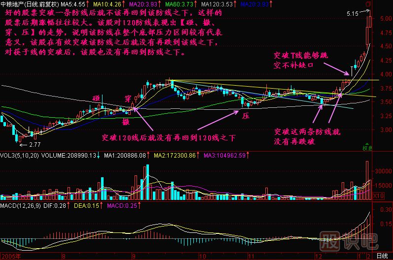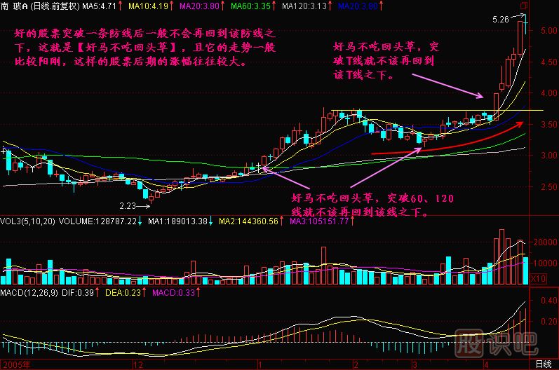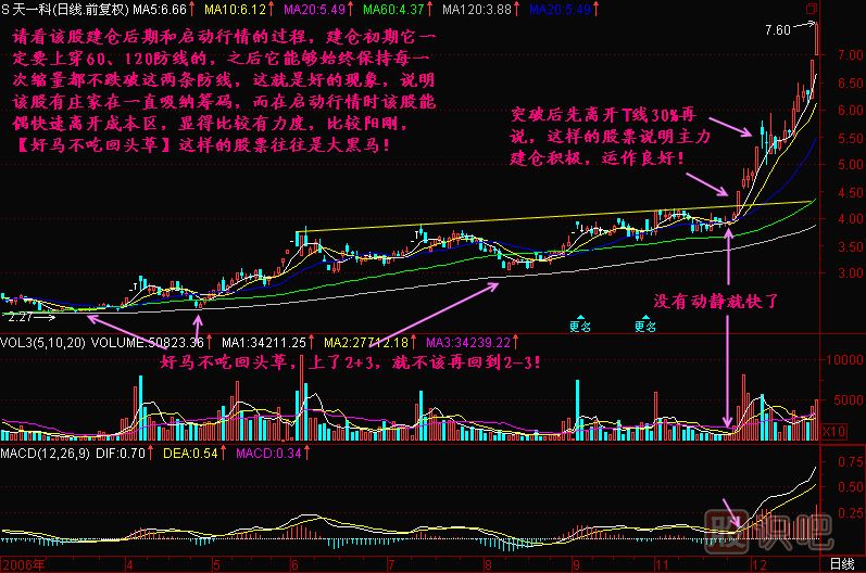 而對于能夠在大盤見底開始上漲之后做到好馬不吃回頭草的股票,說明主力決心堅決,且資金實力較強!他比較看好該股的后市,也許基本面有什么不為人知的利好,而該利好只有主力知道。這樣的股票往往在突破一條防線之后就不會再回到該防線之下,且股價走勢比較有陽剛之氣!突破T線后往往能夠快速拉離成本區(qū)一段路,這樣的股票除了主力自身較自信外,還表現(xiàn)一個實質(zhì),主力不肯給散戶過多逢低吸納的機會,這樣的股票后期漲幅往往較大!