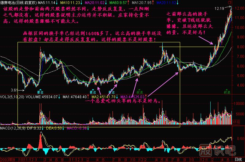 我們今天講的題目是什么呢?用了一句老話,下象棋時怎么說?好馬不吃回頭草,一往無前向前跑。好馬不吃回頭草,好股也是這樣,一旦沖過這根c線,就不應(yīng)該再在c線回頭,不應(yīng)該再跌回來。一旦沖過去以后,d線就應(yīng)該踩在腳下了,現(xiàn)在這只股票把c線、d線的高點連線踩住以后,它就不回來了,然后一舉沖過8.32元。好馬不吃回頭草,這才是真正的大黑馬,沖過8.32元,頭頂一片藍天。它再想來吃回頭草也不能了,因為已經(jīng)騰飛了嘛。