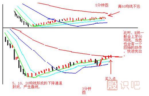 條件1、在3分鐘圖上,下降通道已封閉,5、10、20均線已走平粘合,正在靠近紅色的60均線。2、在5分鐘圖上,紅色60均線開始走平,或已經(jīng)走平。