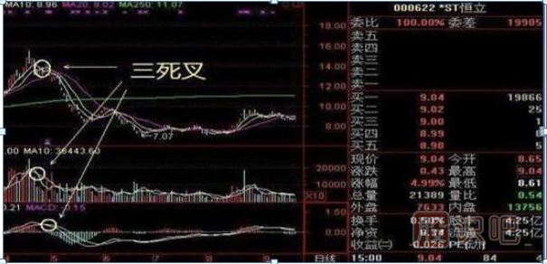 三死叉,也就是說當股價均線、成交量均線、MACD指標都出現(xiàn)三死叉的時候,此時應該果斷賣出??聪聢D中的st恒立,出現(xiàn)三死叉后股價一路下滑。