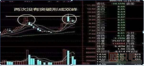 股價連續(xù)兩次沖擊某個價位都出現(xiàn)了回落,K線組合看起來就是兩個高高的雙峰。像山西三維就是這個走勢,近期兩次沖擊9.5沒有成功,股價只能順勢回落。