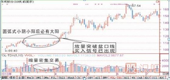 一個(gè)是在圓弧底位會(huì )出現密集交易區,(密集交易就是說(shuō)持續幾天的K線(xiàn)長(cháng)短差不多);