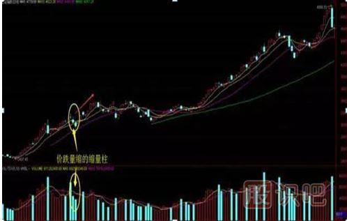 高量柱后大多數股價(jià)走低,但是也有股價(jià)走高的情況,即“價(jià)漲量縮”。如下圖: