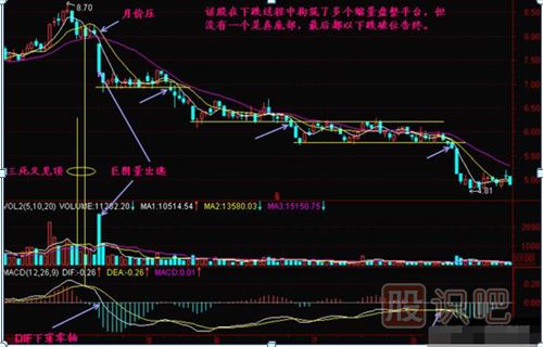 (2)當跌勢進(jìn)入無(wú)量階段時(shí),下跌速度將會(huì )減緩,這也是正常的物理減速過(guò)程。問(wèn)題是未來(lái)看中該股的莊家不甘心把時(shí)間浪費在縮量減速過(guò)程中,他可能采取打壓的手法,利用低開(kāi)盤(pán)殺尾盤(pán)來(lái)加速股價(jià)下跌。這樣的話(huà)股價(jià)仍能維持原有速率下跌,甚至出現加速下滑的可能。