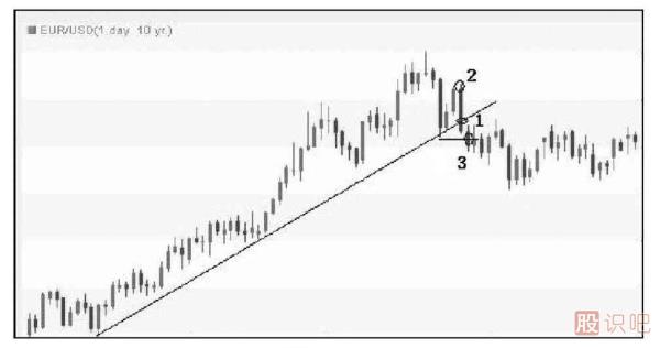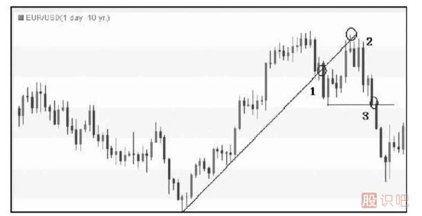 圖1-1是歐元/美元日圖走勢。匯價(jià)首先跌破了上行趨勢線(xiàn),滿(mǎn)足了條件1。之后匯價(jià)再次上探前高,未能創(chuàng )下新高,滿(mǎn)足了條件2(高位錄得一根吊頸K線(xiàn)),之后匯價(jià)跌破了兩個(gè)高點(diǎn)之間低點(diǎn),即最近低點(diǎn),滿(mǎn)足了“跌破前低”的條件3。投資者可以選擇匯價(jià)在突破低點(diǎn)、滿(mǎn)足第三個(gè)條件時(shí)做空,這一法則的順序是1——2——3。