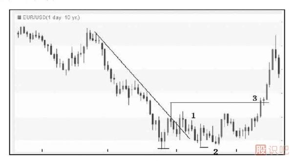 圖1-5是英鎊/美元日圖走勢。匯價(jià)受到下行趨勢線(xiàn)打壓持續下跌,但是創(chuàng )下最低點(diǎn)后,匯價(jià)開(kāi)始反彈,下方的次低點(diǎn)形成(達到條件2)。其后匯價(jià)突破了最低點(diǎn)和次低點(diǎn)之間高點(diǎn)(條件3形成),并最終突破趨勢線(xiàn)(達到條件1)。本例中123法則形成的順序是2——3——1。
