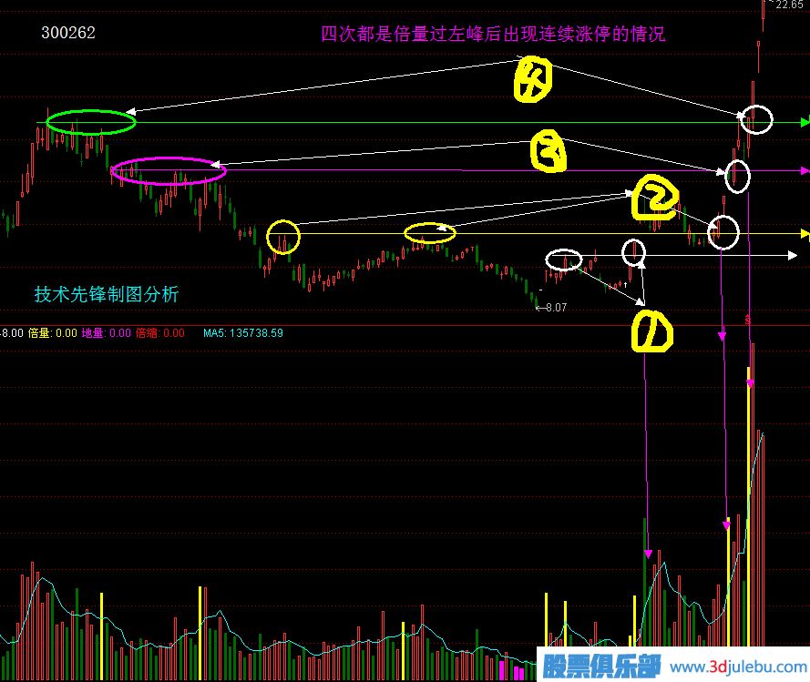 其實(shí)這種模式,單從成交量方面來(lái)說(shuō)的話,可以簡(jiǎn)單概括為一句話:“倍量過(guò)左峰,漲停急先鋒”。拿最近幾個(gè)月的最大牛股300262為例來(lái)簡(jiǎn)要表述一下吧: