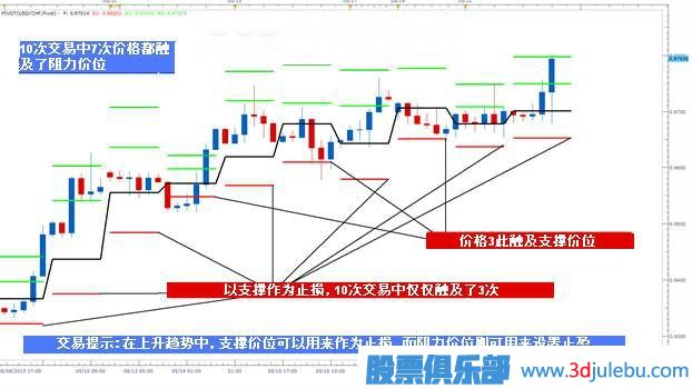 在下跌趨勢中,價格有可能會反彈至軸心點附近,這時候交易者便可順勢開倉做空,而後將相應的支撐線作為止盈位置,而將阻力位置設為止損。試以此法運用於英鎊/美元中(如上圖所示),我們可以看到在10次交易中,有7次交易都成功地獲利了結,而僅有3次以止損收場。毫無疑問,這種交易方法存在著很高的勝率。