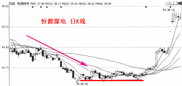 可以少量買(mǎi)入,如果股價(jià)在盤(pán)整后繼續下跌,則應該及時(shí)止損出常 如圖所示恒源煤電日K線(xiàn)圖。從圖中可以看到,股價(jià)在35.81元附近開(kāi)始長(cháng)期橫盤(pán),結束了之前的暴跌行情,這說(shuō)明,在這個(gè)價(jià)位附近,有大量的多方進(jìn)入市場(chǎng),空方的下跌動(dòng)力開(kāi)始減弱。因此短線(xiàn)交易可以在此時(shí)少量買(mǎi)入股票,因為當盤(pán)整行情結束時(shí),多方有可能取得這場(chǎng)較量的勝利,未來(lái)行情可能轉變成上升的趨勢。此時(shí)如果能夠買(mǎi)入股票,可以說(shuō)是以最低價(jià)買(mǎi)入的。