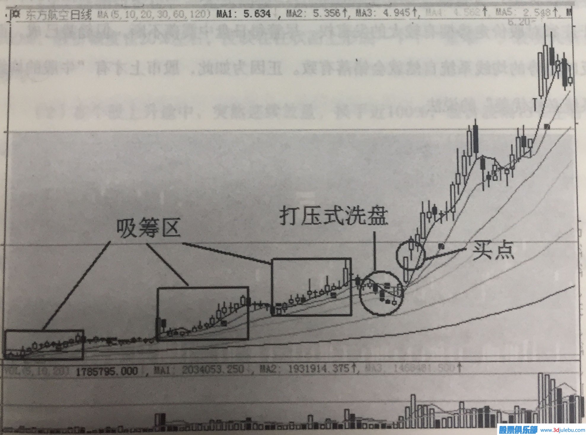 在圖1-3中我們標(biāo)出該形態(tài)下的買點(diǎn),在此處買入對(duì)散戶而言可以實(shí)現(xiàn)時(shí)間于收益的最優(yōu)。在在短的時(shí)間內(nèi)就會(huì)有很好的收獲。當(dāng)然在圖中的吸籌區(qū)也可以作為中長(zhǎng)線買點(diǎn)。但我們不會(huì)建議散戶朋友們?cè)诖藭r(shí)介入,在圖中大家也能看到答案。吸籌的過程必然伴隨洗盤的存在。 洗盤雖方式可以不同但伴隨在整個(gè)吸籌過程中。在以后的章節(jié)我 我們會(huì)詳解洗盤的方式。