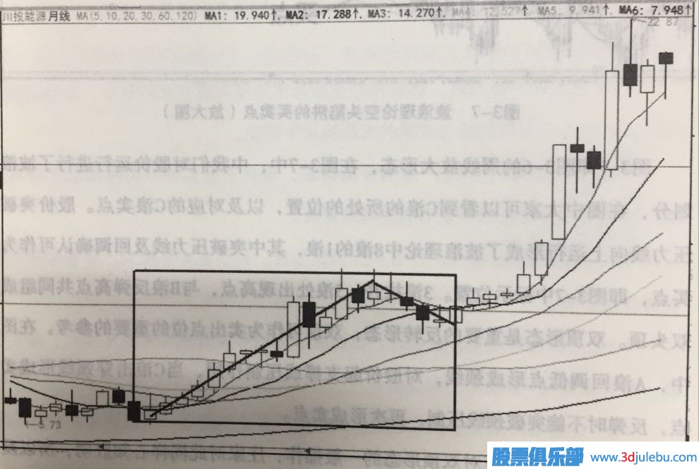 圖3-6是川技221年1月至1月的月線(xiàn)走勢。月線(xiàn)級別的K線(xiàn)走勢清晰明了,大家都能清楚地看到股價(jià)所在的位置,在圖中我們也把月線(xiàn)級別的1浪和2浪做了標示。為了使大家更清楚地看到莊家利用波浪理論布置的空頭陷阱,我們對1浪和2浪做了放大處理。