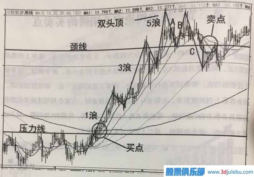 圖3- 7即圖3 -6的周線(xiàn)放大形態(tài),在圖3-7中,中我們對股價(jià)運行進(jìn)行了波浪劃分,在圖中大家可以看到C浪的所處的位置,以及對應的C浪賣(mài)點(diǎn)。股價(jià)突破壓力線(xiàn)向上運行形成了波浪理論中8浪的1浪,其中突破壓力線(xiàn)及回調確認可作為買(mǎi)點(diǎn),即圖3-7中標示位置。3浪拉升,5浪處出現高點(diǎn),與B浪反彈高點(diǎn)共同組成雙頭頂。雙頂形態(tài)是重要的反轉形態(tài),雙頂可作為賣(mài)出點(diǎn)位的重要的參考。在圖中,A浪回調低點(diǎn)形成頸線(xiàn),對股價(jià)起支撐或壓制作用,當C浪擊穿頸線(xiàn)形成賣(mài)點(diǎn),反彈時(shí)不能突破頸線(xiàn)壓制,再次形成賣(mài)點(diǎn)。