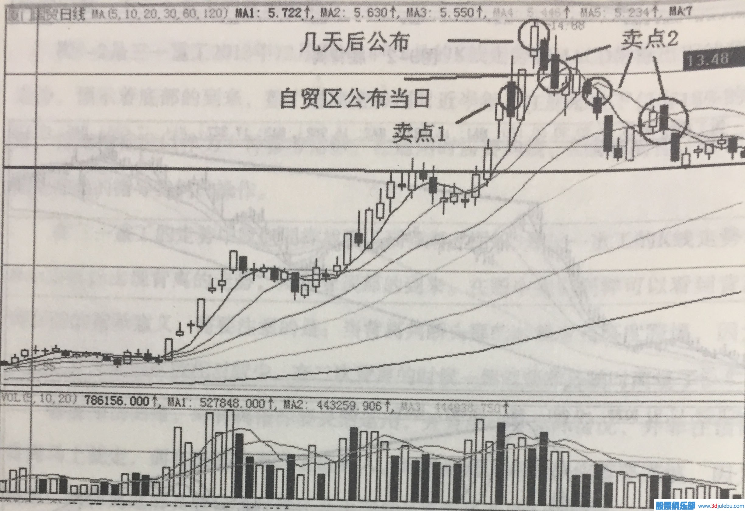 的低點(diǎn)迅速拉升到高點(diǎn)時(shí)的14元多,這時(shí)莊家的賬面盈利已經(jīng)實(shí)現,那么如何出貨把賬面上的收益轉化為實(shí)際盈利就變成了莊家的頭等大事。在圖9-4中我們可以看到莊家的操作方法就是借利好出貨。在有消息公布說(shuō):幾天后自貿名單公布時(shí),股價(jià)走到了最高點(diǎn)。在此時(shí)莊家對出貨已經(jīng)急不可耐了,這個(gè)從前面長(cháng)上下影大陰線(xiàn)可以看出。并且伴隨的是放量。