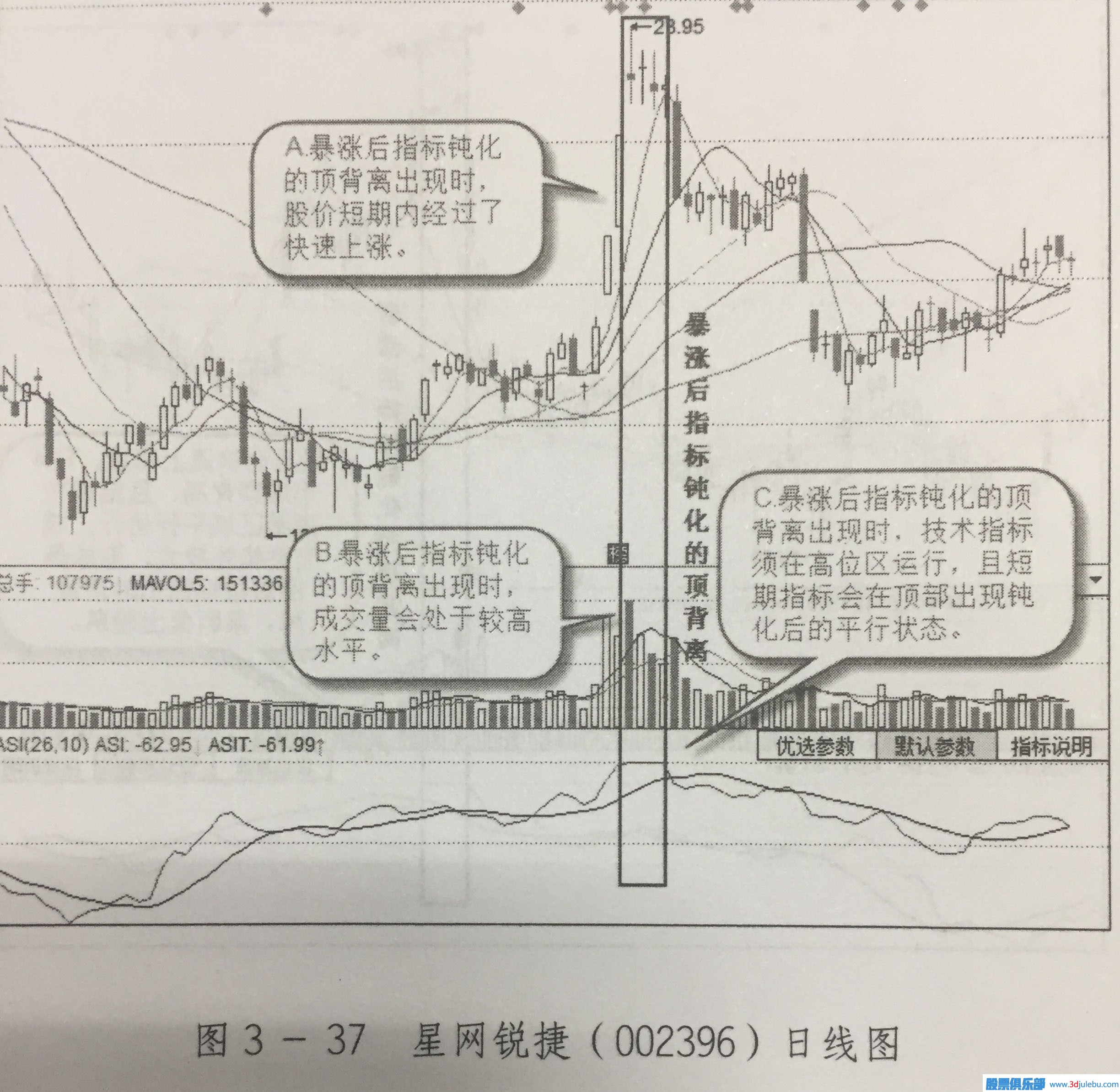 (2)暴漲后指標鈍化的頂背離如果是出現在牛市中時(shí),是在牛市初期,股價(jià)快速告別底部區域時(shí),此時(shí)股價(jià)快速上漲后會(huì )出現高位調整,因此也短線(xiàn)操盤(pán)的賣(mài)點(diǎn)。