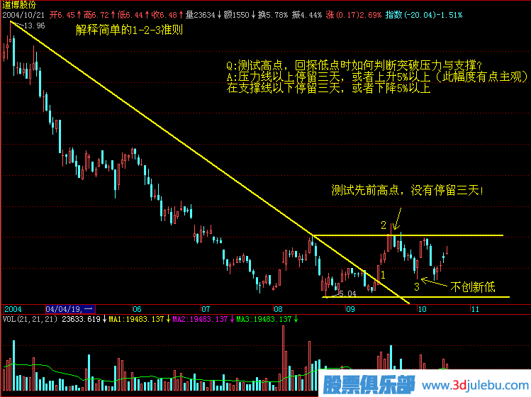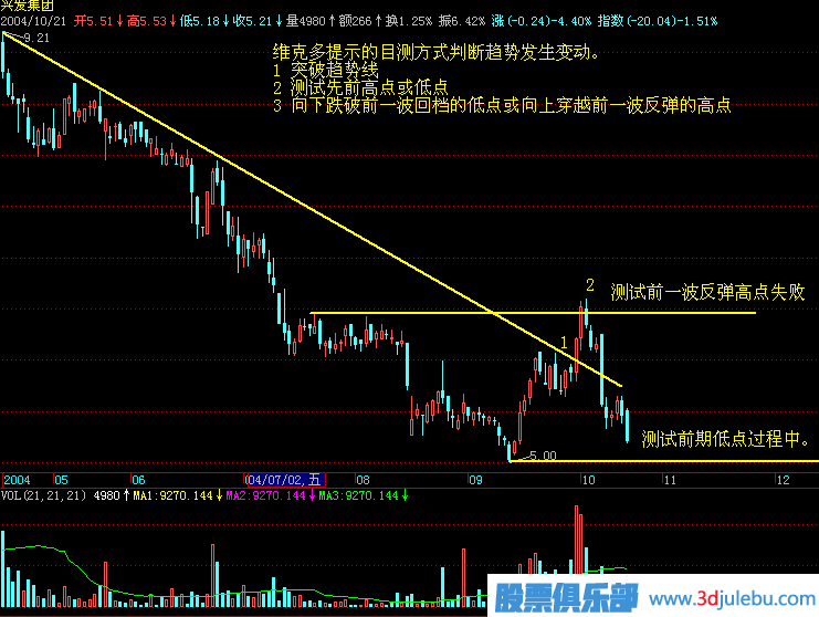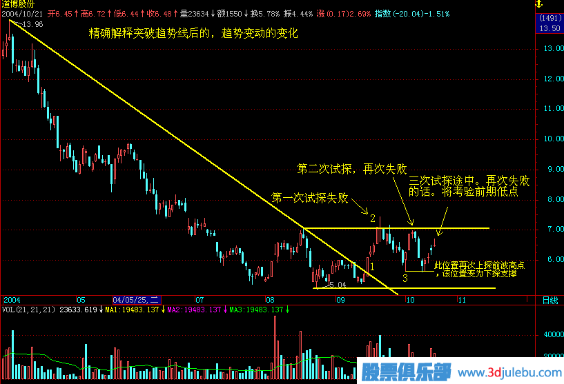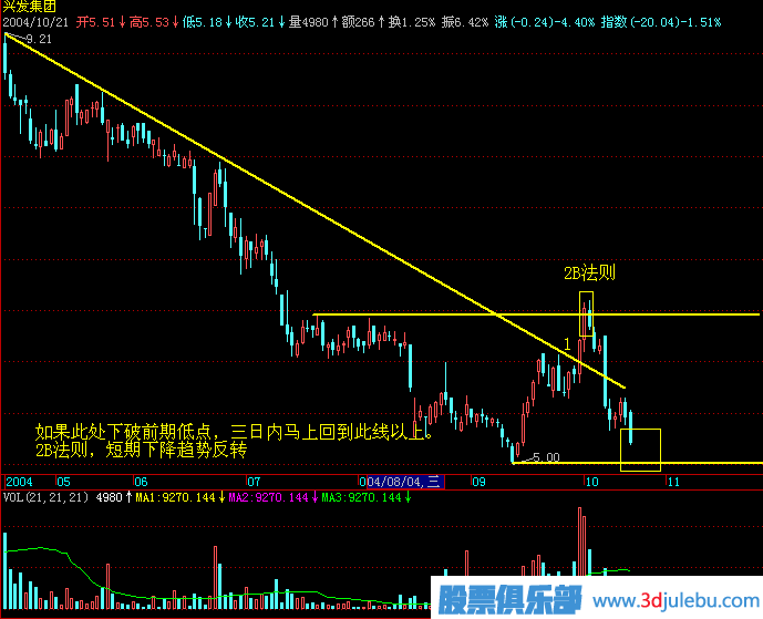 四、2B法則的運用必須是明顯的上升(或者下降如何看盤(pán)和技巧解析趨勢線(xiàn)學(xué)習教程)趨勢后的盤(pán)整,而不是全天都在盤(pán)整的時(shí)候運用2B法則,那只能經(jīng)常來(lái)回止損了。所以切忌在大區間盤(pán)整的時(shí)候運用2B法則!