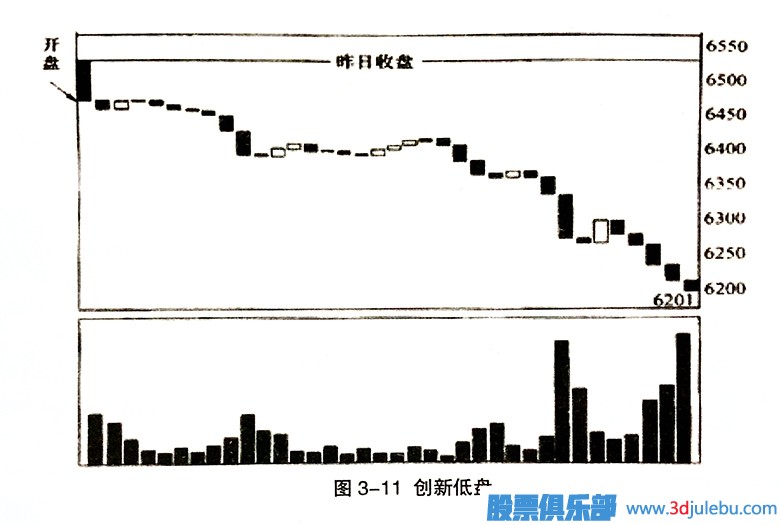 如圖3-11所示,這是一種9:35時(shí)指數(shù)不論是以高盤(pán)、低盤(pán)還是平盤(pán)開(kāi)出,在945時(shí)以前股價(jià)下跌已經(jīng)超過(guò)昨天最低價(jià)的情況。