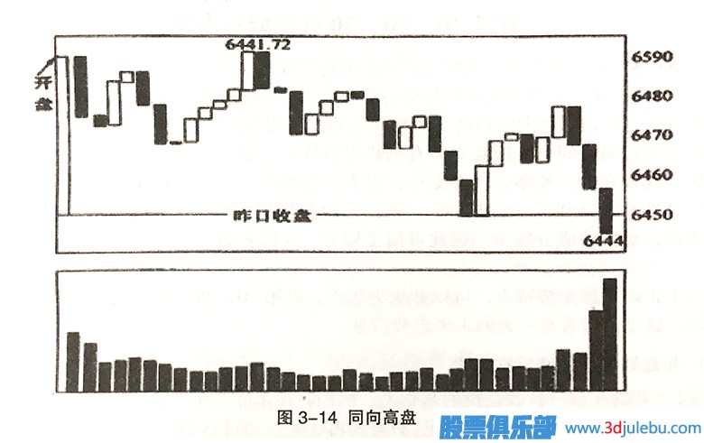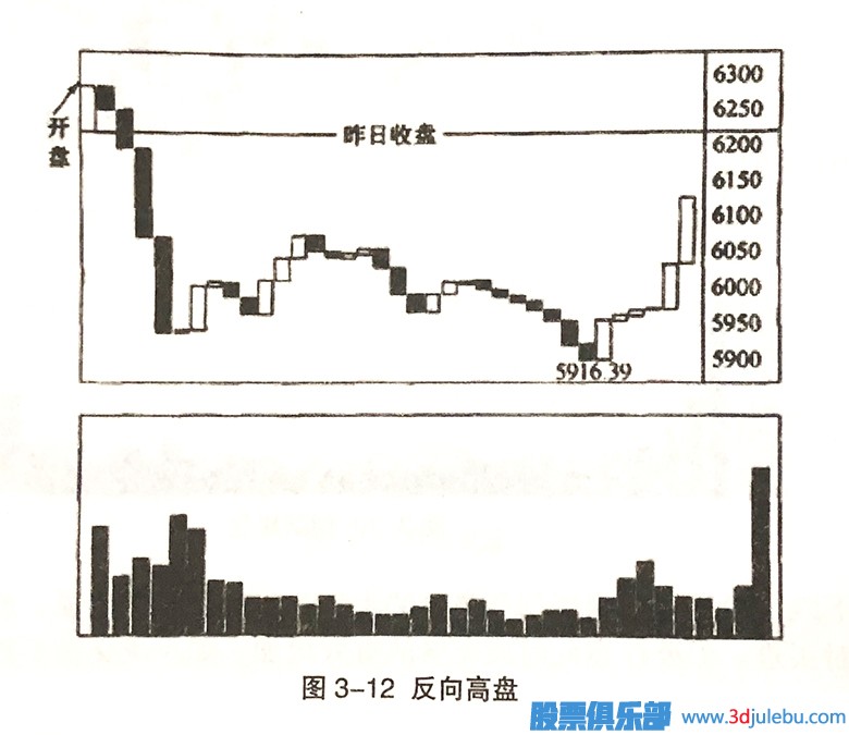 如圖3-8所示,這是一種9:35時(shí)指數(shù)以高盤(pán)開(kāi)出,9:40時(shí)指數(shù)比開(kāi)盤(pán)價(jià)高,但945時(shí)指數(shù)卻比9:40時(shí)還低的情況。