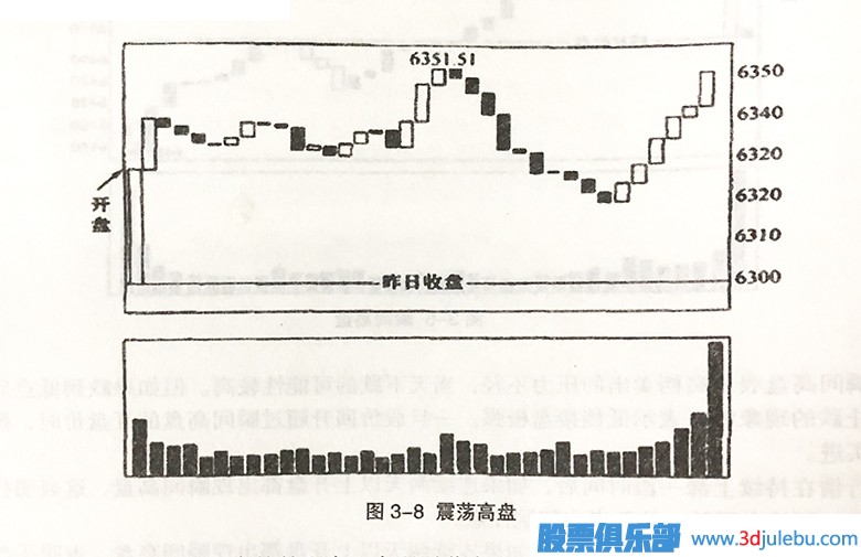震蕩高盤(pán)是多空力量平衡的整理盤(pán)。出現(xiàn)震蕩高盤(pán)時(shí),當(dāng)天會(huì)有兩個(gè)漲跌波段。因此投資者可采取低買(mǎi)高賣(mài)的短線操作原則,以賺取市場(chǎng)差價(jià)。正常情況下,開(kāi)出震蕩高盤(pán)后的第一次上漲波段的高點(diǎn)附近是最理想的賣(mài)出點(diǎn)。
