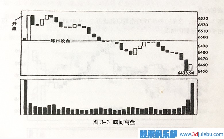 如圖3-6所示,這是一種9:35時(shí)指數(shù)以高盤(pán)開(kāi)出,940和945時(shí)指數(shù)都比開(kāi)盤(pán)價(jià)還低的情況。