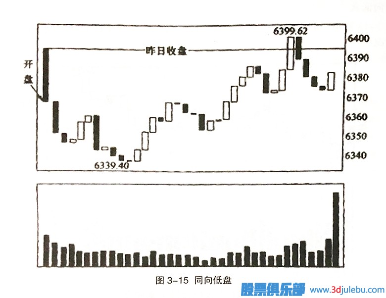 如圖3-15所示,昨天的指數(shù)是以中陰K線下跌收盤(pán),今日9:35時(shí)出現(xiàn)指數(shù)仍然下跌往下跌空以低盤(pán)開(kāi)出的情況。