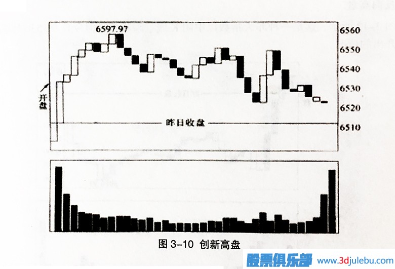 如圖3-10所示,這是一種9:35時(shí)指數(shù)不論是以高盤(pán)或低盤(pán),還是以平盤(pán)開(kāi)出,在945時(shí)以前上漲已經(jīng)超過(guò)前一日最高價(jià)的情況。