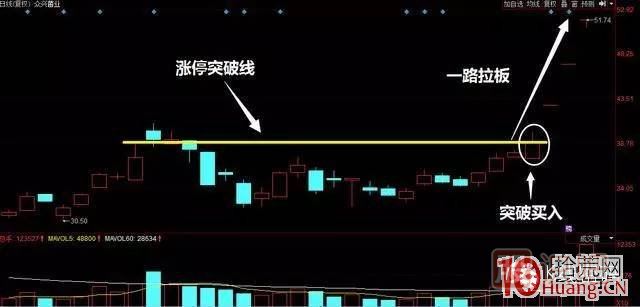 如果此時(shí)K線(xiàn)向上突破這根黃色的漲停突破線(xiàn),此時(shí)果斷買(mǎi)進(jìn),追高也不怕。