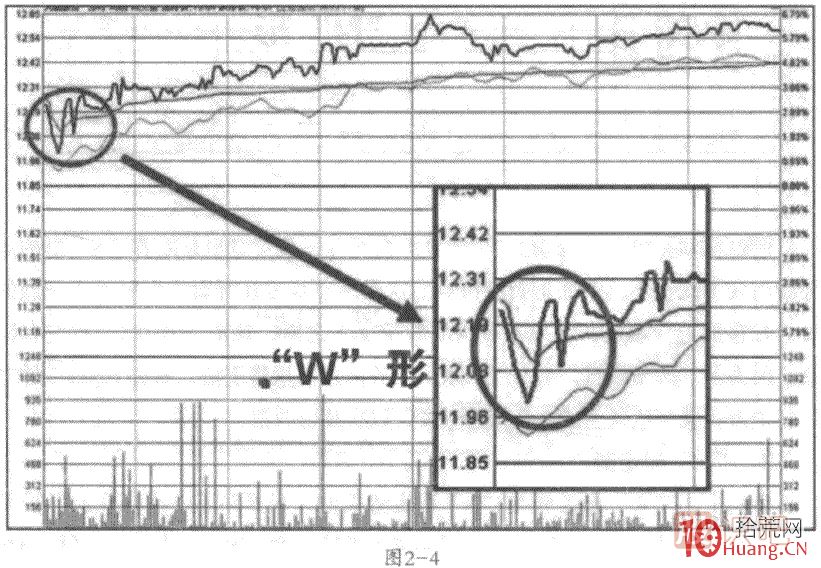 事實(shí)上,“W”形走勢與“N”形走勢類似,只是多了一次探底而已,是二次探底的分時形態(tài),也就是在分時形態(tài)上形成一個“W”形走勢。如圖2-3和圖2-4.
