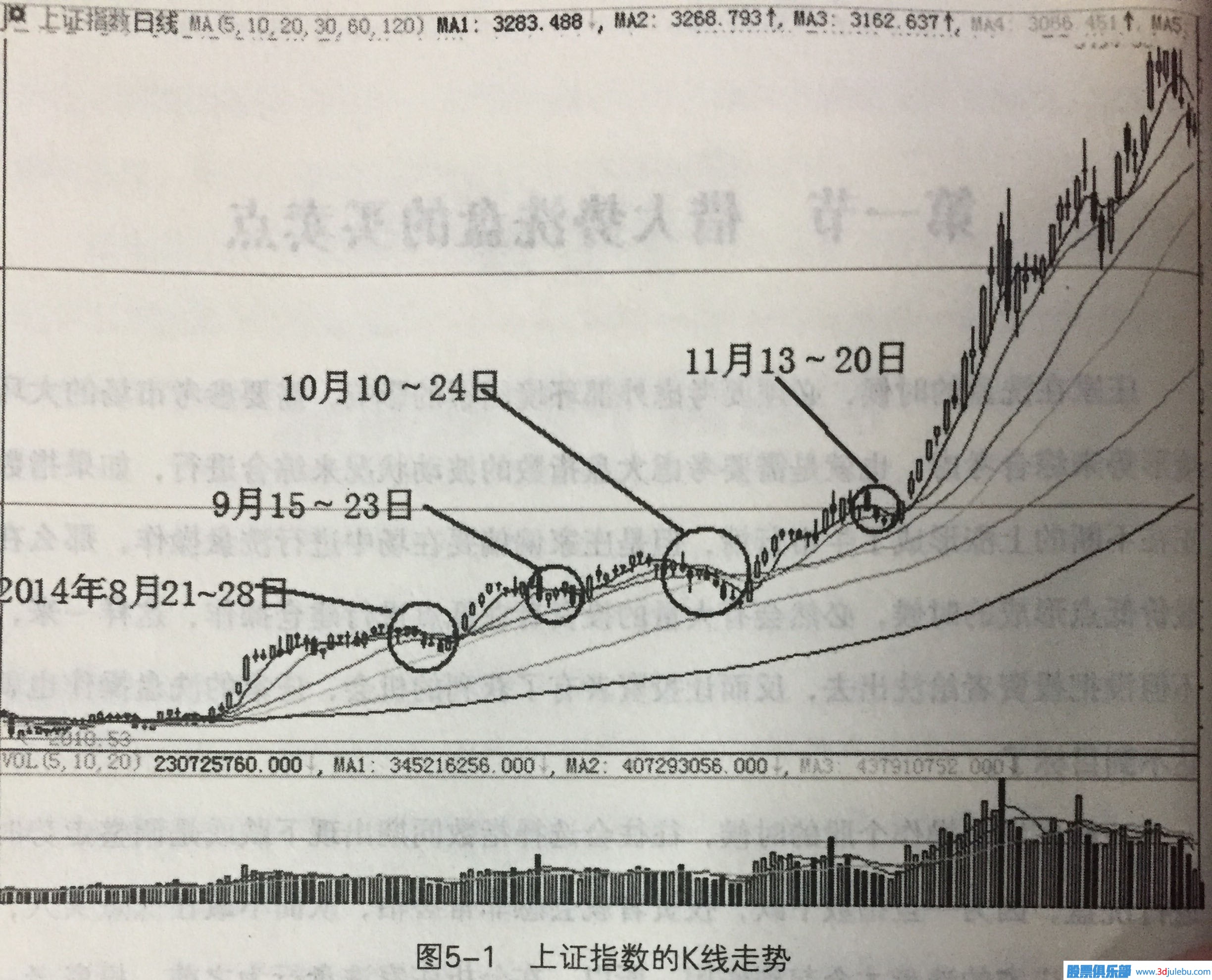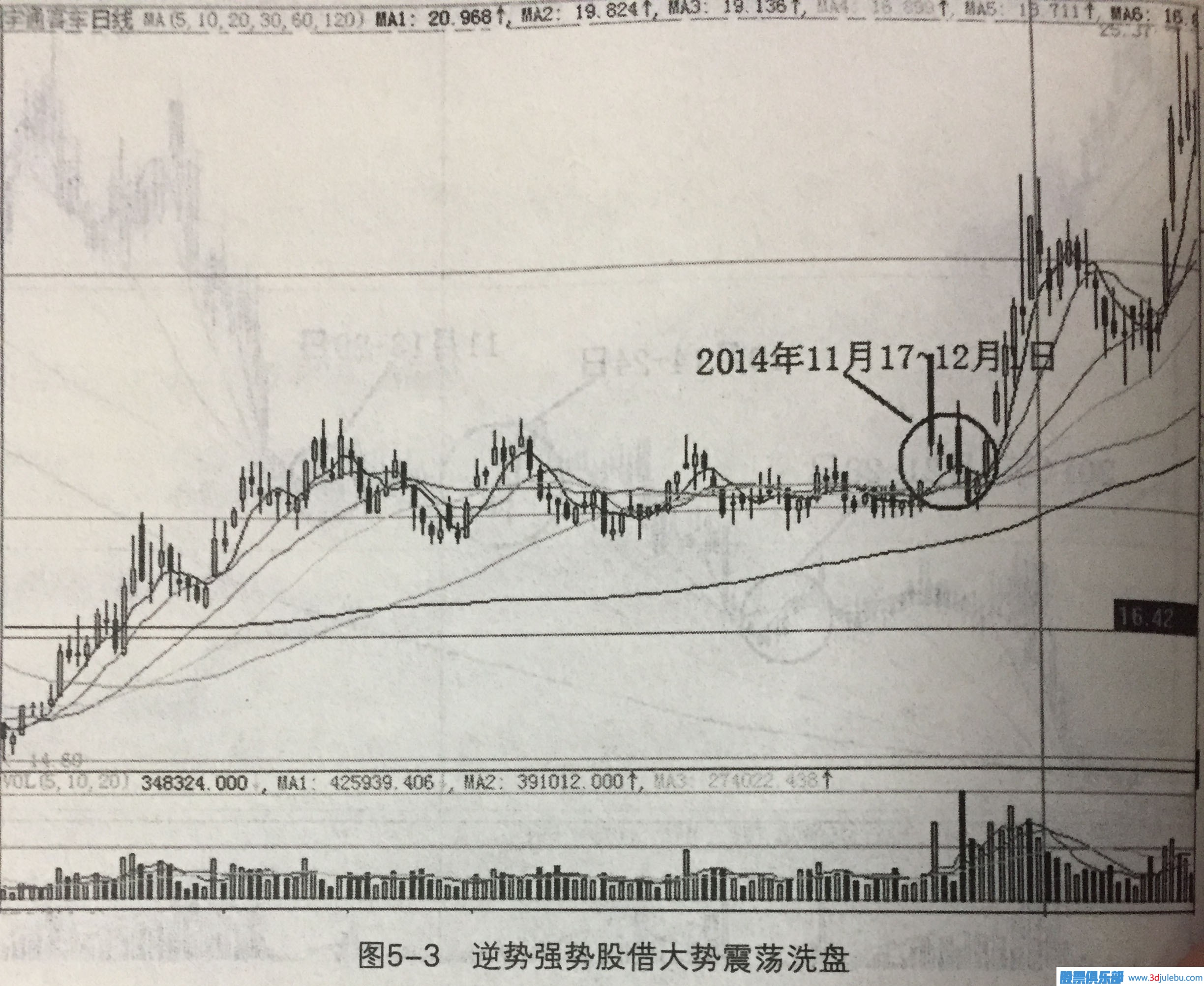 圖5-1是上證指數2014年8月以來(lái)的K線(xiàn)走勢,在大盤(pán)突破2000點(diǎn)這個(gè)平臺后,大盤(pán)出現連續調整,先后跌破20日線(xiàn)、30日線(xiàn),5日線(xiàn)與10日線(xiàn)形成死叉,圖形形態(tài)非常難看,技術(shù)形態(tài)上似乎已經(jīng)形成了向下的破位。但我們仔細分析可以看出,在指數調整時(shí)候,成交量出現了萎縮的跡象,這種量能變化說(shuō)明資金并沒(méi)有在盤(pán)中進(jìn)行出貨操作,如果是資金在出貨成交量怎么可能不放大呢?所以,從量能上來(lái)看指數并未見(jiàn)頂,指數未見(jiàn)頂也就意味著(zhù)盤(pán)中的絕大多數個(gè)股也沒(méi)有形成頂部。所以在這個(gè)時(shí)間段內,只要個(gè)股出現了下跌的走勢, 那就意味著(zhù)莊家正進(jìn)行洗盤(pán)操作的可能性較大。從隨后的上證指數走勢中, 我們就可以驗證到了這一點(diǎn),隨后的幾個(gè)月指數一路上揚,漲勢喜人。