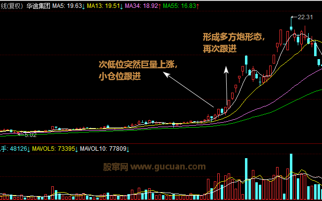 (2)個(gè)股在次低位突然出現巨量,且股價(jià)出現明顯拉升,遇到這種情況建議操作上采取小倉位快速跟進(jìn),因為此位置的巨量拉升往往預示著(zhù)股價(jià)即將進(jìn)入主升浪,股價(jià)將快速上漲。小倉位跟進(jìn)后如果繼續放量上漲,則可大量跟進(jìn)甚至全倉殺入,待股價(jià)上深趨勢減緩或開(kāi)始出現走軟痕跡時(shí)全倉離常