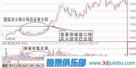 圓弧形態(tài)一般出現在調整后或者橫盤(pán)整理挖坑后走出的圖形,從技術(shù)形態(tài)上看有二個(gè)特別現象是,一個(gè)是在圓弧底位會(huì )出現密集交易區,(密集交易就是說(shuō)持續幾天的K線(xiàn)長(cháng)短差不多),二是均量萎縮,但是陽(yáng)線(xiàn)是有帶量的,陰線(xiàn)非??s量。但在圓弧快形成階段量能會(huì )逐步放大,這個(gè)階段為初步買(mǎi)入信號出現,一旦放量突破前弧口處為黃金介入點(diǎn),如果你錯過(guò)這一點(diǎn)位,那么一般突破后都會(huì )有一個(gè)回落過(guò)程,當然回落不破支撐線(xiàn)可再一次介入信號出現。如果這一次買(mǎi)入信號錯過(guò)你必將后悔,因為后面少有機會(huì )介入了,不管后市怎么調整也難回到前面這個(gè)價(jià)位。一般出現類(lèi)似圓弧圖形的,在后期都會(huì )走一大波行情出來(lái),圓弧越大,主力吸籌越多,后市走向越高。
