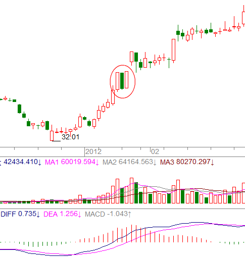 上圖的最后三根K線中,前兩個(gè)陰線可結(jié)合成為一個(gè)跌停板,最后一個(gè)漲停板,即跌停(地)漲停(天)板。