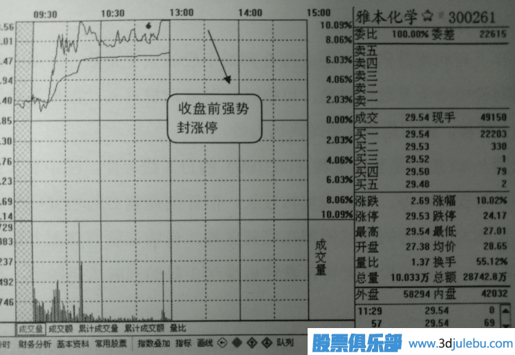 如圖4所是當天該股封漲停時(shí)的分時(shí)走勢圖,圖中可見(jiàn)該股當天在不到十點(diǎn)半便被巨單強勢封漲停,可見(jiàn)上述的上壓下式掛單的有效性。