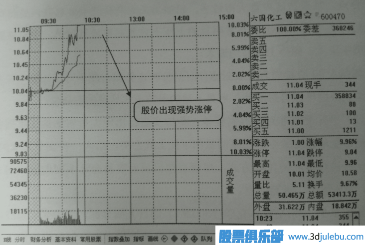 如圖3所示是六國化工的K線(xiàn)界面,圖中顯示該股當天當時(shí)已經(jīng)上漲5個(gè)百分點(diǎn),且外盤(pán)比內盤(pán)大得較多,已知當天農藥化肥板塊領(lǐng)漲,另外可觀(guān)察到當時(shí)的買(mǎi)賣(mài)檔已經(jīng)出現非常明顯的上壓下式非對稱(chēng)蜂窩掛單,說(shuō)明該股當天法停概率很大,操作上可適當追入。