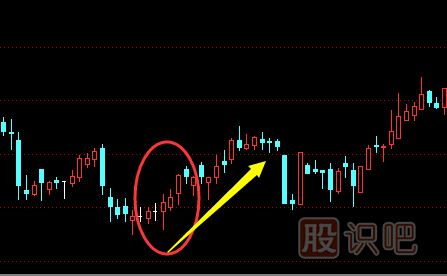 4。孕之兵K線圖。通常情況下我們把高位出現一根大陽線之后,緊接著在這根大陽線實體中間部位出現小陰線我們稱之下跌孕,反之,在低位出現一根大陰線后,緊接著在這根大陰線實體部位出現小陽線我們稱之為上漲孕,通常孕之反轉屬于被動性的較多,因而反轉的速度較慢。如圖:
