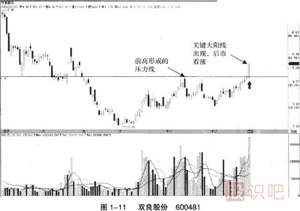 (4)大陽線突破調(diào)整壓力線,成交量之放大。