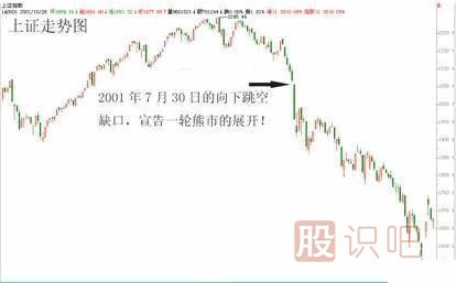 例如:2001年7月30日,大盤以2056點(diǎn)跳空9點(diǎn)低開,并且留下一根實(shí)體達(dá)100多點(diǎn)的大陰線,宣告一輪大熊市的展開。(見下圖)
