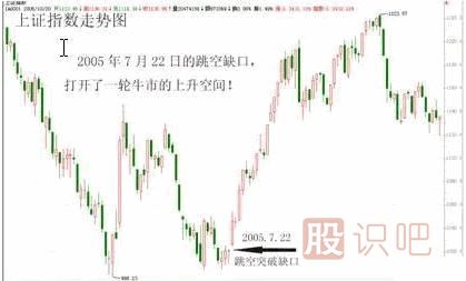 例如,2005年7月22日,上證指數(shù)以1026點(diǎn)跳空高開,并且當(dāng)天大漲2.52%,迅速脫離1000點(diǎn)這個(gè)“危險(xiǎn)”的整數(shù)關(guān)口,其后一輪轟轟烈烈的大牛市就此展開。如圖: